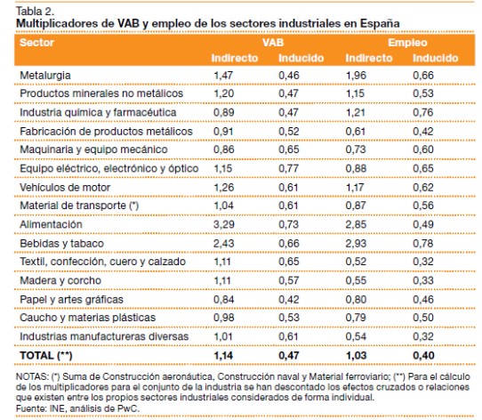 De acuerdo con un informe de la consultora PwC patrocinado por Siemens, por cada euro de PIB generado de forma directa por la industria en su conjunto, se generan 1,14€ adicionales de forma indirecta en la cadena de valor (gracias al valor añadido generado por los proveedores de las empresas industriales), y 0,47€ de forma inducida (gracias a las rentas de los trabajadores de la industria). Y por cada empleo generado de forma directa se generan 1,03 empleos indirectos y 0,40 empleos inducidos.