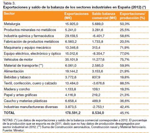 Por otro lado, la industria acaparó el 52,8% de las exportaciones españolas, con un superávit de más de 8.500 millones de euros. Los sectores que más exportan en términos absolutos son: los vehículos de motor, la industria química y farmacéutica, la alimentación y la metalurgia; los que menos, madera y corcho, minerales y caucho.