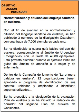 Según el proyecto de presupuestos para 2014, sólo en los seis primeros meses de 2013 ya se han registrado 2.500 accesos. El reconocimiento se hará a través de los contratos-programa que cada año suscriben los organizadores que integran el Servicio Vasco de Salud y con los que se financian. De este modo, la cuantía de los contratos se verá parcialmente condicionada por el cumplimiento o no de objetivos e indicadores en el empleo del euskera.