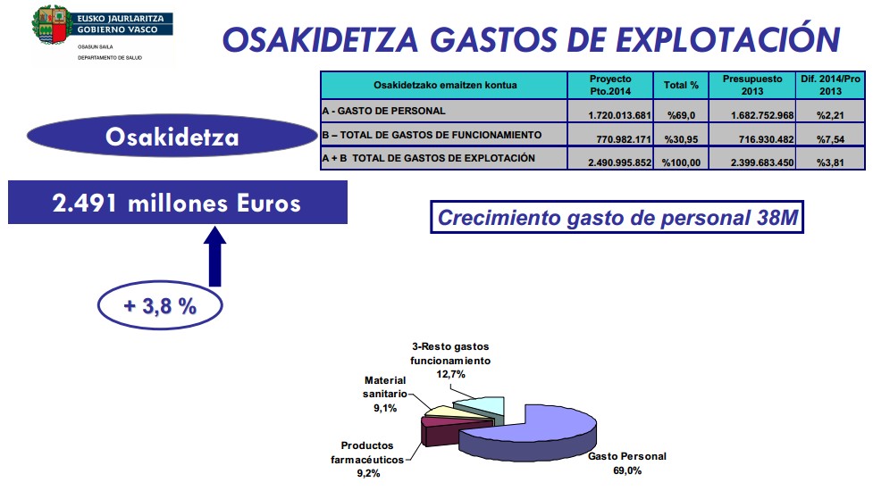 Concretamente, el presupuesto para el Servicio Vasco de Salud roza los 2.491 millones, un 3,8% más que en 2013. De este presupuesto, 1.720 millones (el 69% del total) está destinados a gastos de personal. Esta partida ha crecido un 2,2% respecto a 2013, pese a la congelación salarial y el aumento de la jornada laboral. Sucede de esta manera por la obligación de computar las nuevas antigüedades o por mejoras de categorías que se vayan originando a lo largo del año.