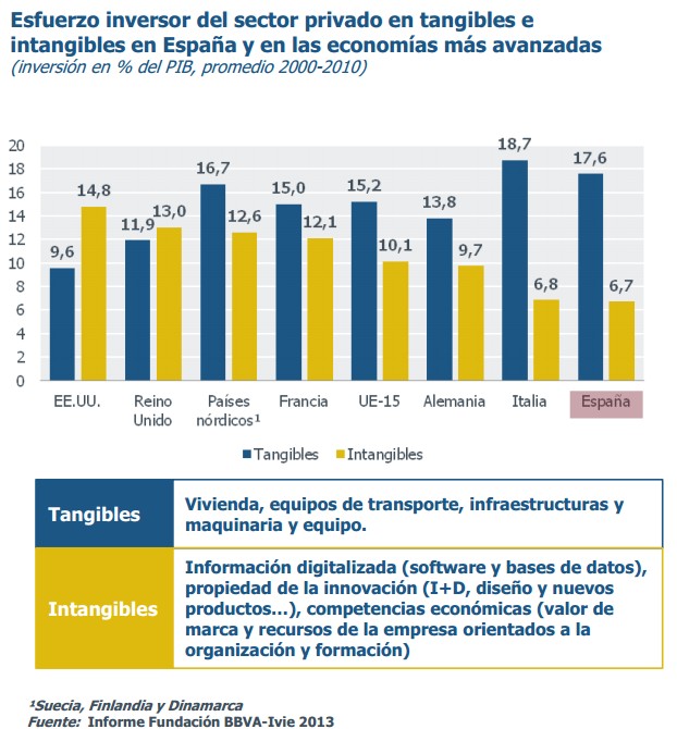 El problema es que la inversión en intangibles en España es baja, apenas el 6,7% del PIB, menos del 40% de la inversión en activos tangibles (capital físico), cuando en Estados Unidos representa un 150%.