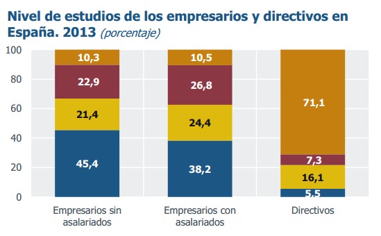 Mientras el 71,1% de los directivos son universitarios, ese porcentaje se reduce al 10,5% entre los empresarios con asalariados y al 10,3% entre los autónomos, pero estos dos últimos grupos son los mayoritarios. Las empresas grandes y las multinacionales, gestionadas con frecuencia por directivos profesionales, logran mayores niveles de eficiencia y productividad.