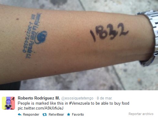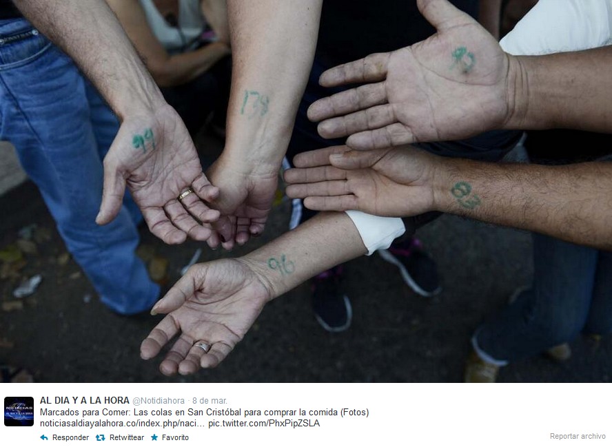 La grave escasez de alimentos y productos básicos que sufre Venezuela ha provocado el surgimiento de interminables colas en algunos supermercados para poder comprar comida. La situación ha llegado a tal extremo que los venezolanos son marcados con números para ordenar la entrada a estos establecimientos y evitar así que la gente se cuele.