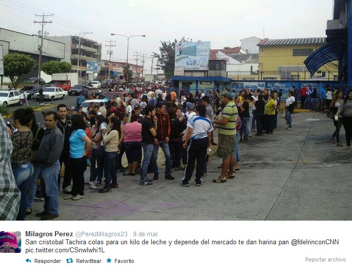 Es el caso, por ejemplo, de San Cristóbal, donde los venezolanos llavan varios días sufriendo largas esperas para acceder a los establecimientos. Muchos llegan al supermercado gubernamental de San Cristóbal a las dos de la mañana, seis horas antes de que abra sus puertas, para coger un buen sitio en la fila y comprar los productos que necesiten antes de que se agoten.
