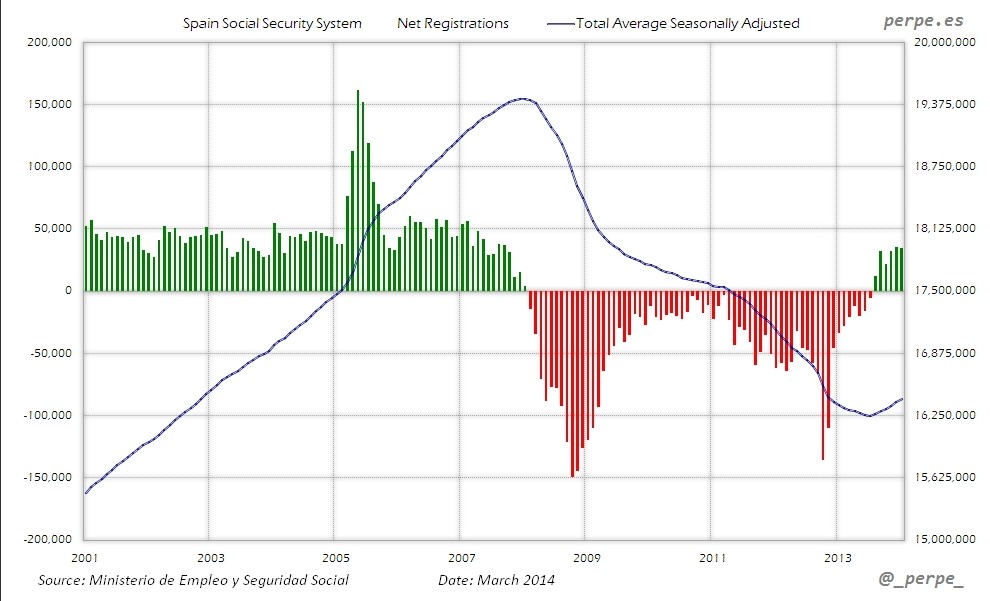 Tal y como refleja el siguiente gráfico, el cambio de tendencia comenzó el pasado septiembre, cuando la afiliación desestacionalizada comenzó a crecer. La histórica destrucción laboral que ha sufrido España tocó fondo en 2013, y los últimos datos ya avanzaban creación neta de empleo en los primeros meses del presente año.