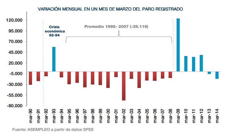 En este sentido, cabe recordar que marzo es, tradicionalmente, un mes en el que suele reducirse el paro. Sin embargo, esta tendencia cambió por completo durante la crisis. No en vano, el desempleo creció este mes una media de 41.163 personas en el último lustro. El descenso de este año es el segundo que se produce desde 2009, tras el registrado en marzo de 2013, cuando bajó en 4.979 personas.