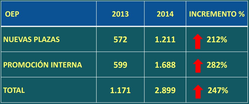 El Consejo de Ministros ha aprobado este viernes la oferta de empleo público (OEP) que anunció esta semana el ministro de Hacienda, Cristóbal Montoro. La OEP para 2014 incluye 1.688 plazas de promoción interna y otras 1.211 de nuevo ingreso. En las plazas de nuevo ingreso, se trata de una cuantía que duplica a las 572 de 2013. El ministerio que dirige Montoro ha sido el encargado de elaborar la presentación que ha utilizado el ministro para explicar la oferta de empleo público durante la rueda de prensa ante los periodistas.