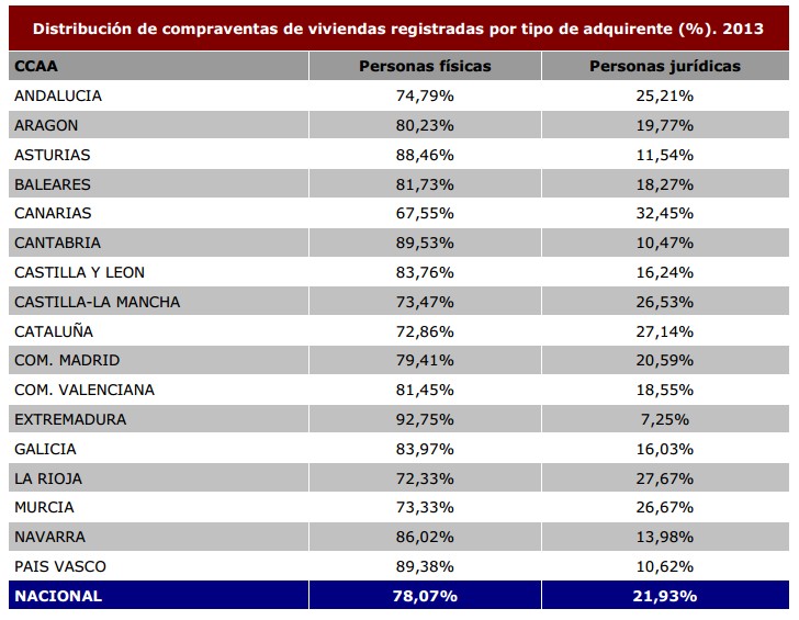 Por otro lado, el estudio destaca que las compras de viviendas realizadas por personas jurídicas (empresas) representaron el 21,93% del total, lo que supone un incremento del 429% con respecto al 5,11% que representaban en 2007, antes de la crisis. Por el contrario, las personas físicas pasaron de protagonizar el 94,89% de las compraventas en 2007 al 78,07% en 2013.