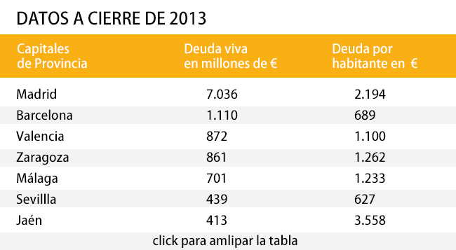 A Madrid le siguen, de lejos, otras cuatro grandes ciudades. Barcelona es la segunda capital de provincia más endeudada, con 1.110 millones de euros; seguida de Valencia, con 872 millones; Zaragoza, con 861 millones y Málaga con 701 millones. Bilbao se sitúa en el lado contrario de la tabla, con una deuda que apenas supera los 7 millones de euros. Huesca (16 millones), Pontevedra (19 millones), Cáceres (20 millones) y Zamora (21 millones), están detrás de la capital vasca.