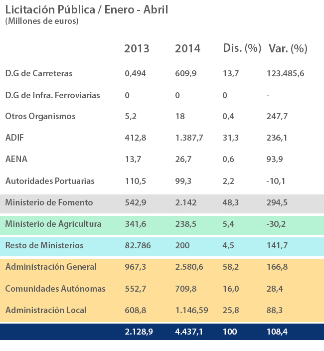 Según el último informe de la patronal de las grandes constructoras (Seopan), en los cuatro primeros meses de este año, el Ejecutivo incrementó la licitación de obra pública un 108% en comparación con el mismo periodo de 2013. Así, el presupuesto de las obras que se sacaron a concurso entre los meses de enero y abril alcanzó los 4.437 millones de euros, mientras que el año pasado fue de 2.128 millones.