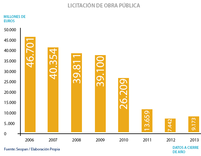 Pero este no es el primer encarecimiento de los contratos públicos desde el inicio de la crisis. Tras 7 años de recortes, el Gobierno cerró 2013 elevando la licitación de obra estatal un 22,9% interanual. En concreto, en 2013, esta partida pasó del mínimo histórico de los 7.442 millones de euros de 2012 hasta los 9.141 millones. Estas cifras contrastan con el récord del gasto en proyectos públicos llevados a cabo en 2006 por el gobierno de José Luis Rodríguez Zapatero, que alcanzó los 46.701 millones de euros.