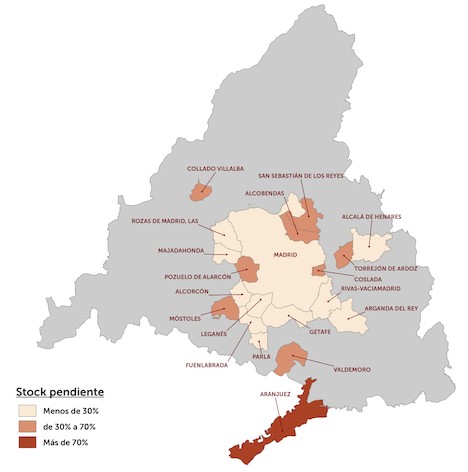 El municipio que recoge mayor número de viviendas nuevas en venta es Aranjuez. En concreto, mantiene una concentración de stock superior al 70% del total de promociones recogidas en el estudio. En un segundo nivel de oferta se encuentran municipios como Móstoles, Getafe, Rivas Vaciamadrid, Arganda del Rey, Coslada y Torrejón de Ardoz que superan las 80 unidades de oferta por municipio. Por último, en el resto de municipios y distritos de la capital, se encuentran bajo una media de entre 20 y 80 viviendas nuevas en venta.