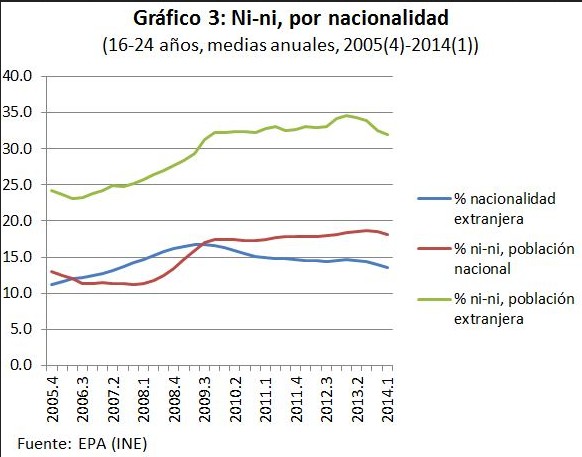 Otro dato relevante a tener en cuenta es la nacionalidad, ya que su porcentaje es mayor entre los jóvenes inmigrantes. En concreto, los jóvenes con nacionalidad extranjera tienen una proporción de ni-nis de casi el 30%, el doble que los jóvenes de nacionalidad española.