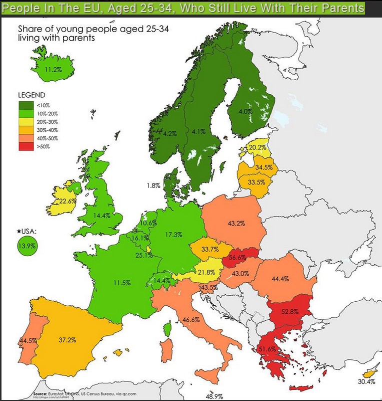 Por último, el elevado paro juvenil que presentan los países periféricos del sur de Europa se refleja en otros indicadores relevantes como, por ejemplo, el porcentaje de jóvenes de entre 25 y 34 años que aún vive en casa de sus padres. En España supera el 37%, aunque se mantiene por debajo de Portugal (44,5%), Italia (46,6%) o Grecia (51,6%), entre otros, según datos de Eurostat.
