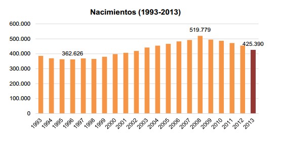 Desde 2008, cuando nacieron 519.779 niños (el máximo en 30 años), el número de nacimientos se ha reducido un 18,1%. El INE apunta que este descenso tiene su origen en una menor fecundidad -el indicador de número de hijos por mujer disminuyó desde el 1,32 en 2012 a 1,26 en 2013- pero también en la progresiva reducción del número de mujeres en edad fértil.