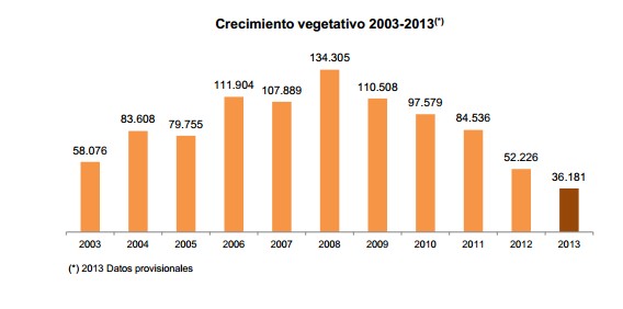De esta manera, el informe señala que los últimos datos no son nada halagüeños y muestran que el crecimiento vegetativo de la población, es decir, la diferencia entre los nacimientos y las muertes, se redujo un 30,7% en 2013 hasta situarse en 36.181 personas, el saldo más bajo registrado desde al año 2000.