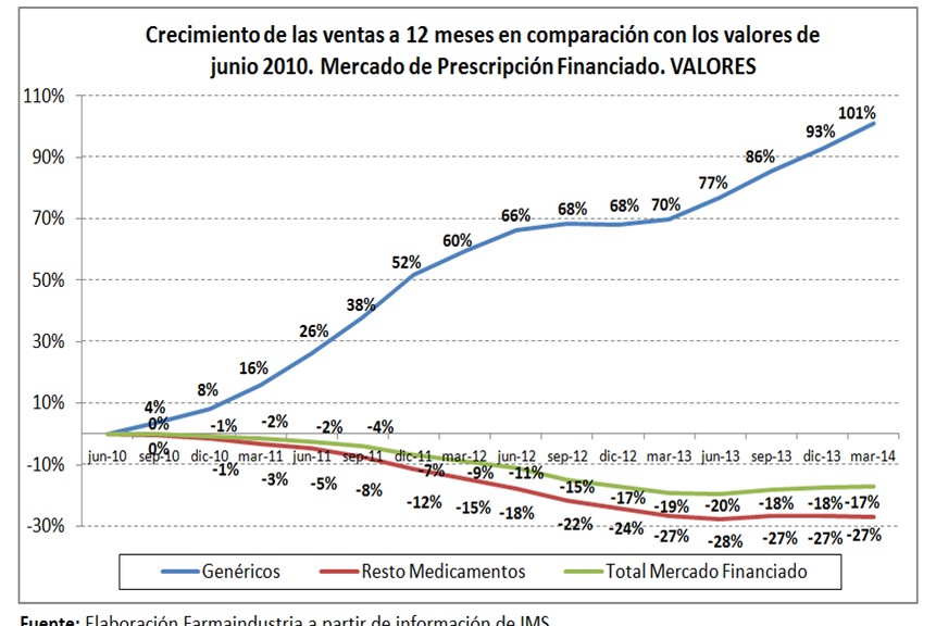 Así, desde el año 2010, la venta de medicinas de marca blanca se ha incrementando un 100% a pesar de que desde junio de 2010, momento anterior a que entrara en vigor el primero de los RDL, y marzo de 2014, el total del mercado de medicamentos de prescripción financiados ha disminuido un 17%.