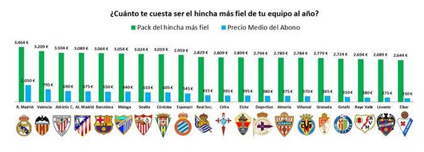 Seguir a su equipo cuesta, de media, para cada seguidor español unos 3.000 euros al año, según un estudio elaborado por la plataforma Lendico. Para extraer las conclusiones del informe, la compañía no sólo ha analizado el precio medio del abono de cada club, sino también ha estimado algunas variables anuales para los 38 partidos de Liga.