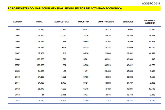 Por sectores económicos de procedencia de los trabajadores, el paro registrado presentó las siguientes variaciones respecto a julio: en Agricultura se redujo en 6.894 (-3,12%); en Industria subió en 5.780 (1,27%); en Construcción se incrementó en 162 (0,03%) y en Servicios subió en 15.161 (0,54%). Por su parte, el colectivo Sin Empleo Anterior se redujo en 6.139 personas (-1,60%).