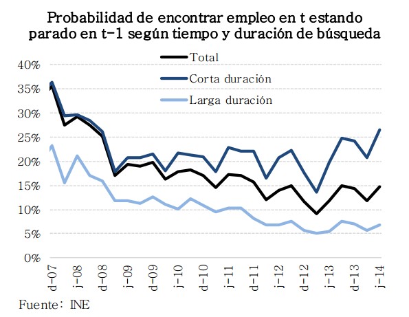 "Hace un año, la probabilidad de encontrar un empleo llevando desempleado menos de 12 meses era del 19,8%, 6,7 puntos porcentuales más baja que en la actualidad, mientras que la de un desempleado de larga duración era similar al nivel en el que se encuentra a día de hoy", añaden.