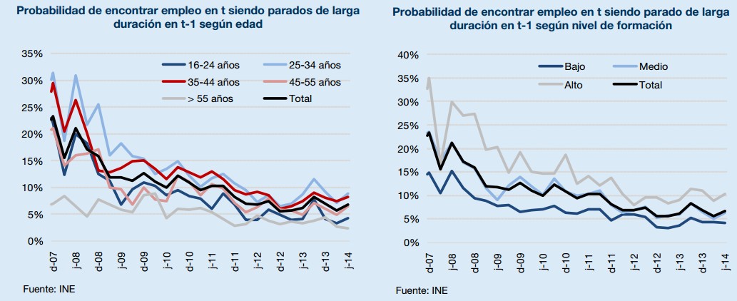 Y el principal problema es que la probabilidad de que encuentre un empleo es hoy de apenas un 6,7%, muy inferior a la del que lleva menos de un año en esa situación (26,5%). "El aumento de las transiciones del desempleo a la ocupación se está concentrando en los parados de corta duración y no así en los que llevan más tiempo en esta situación, no siendo partícipes de la incipiente mejora del entorno económico", aclaran los expertos.