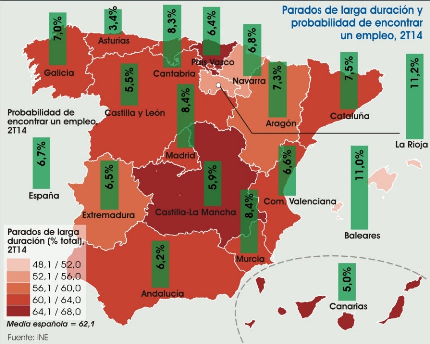 Es el caso de las Islas Canarias y Castilla-La Mancha. En el lado contrario destaca Islas Baleares, que, además de tener un problema de desempleo de largo plazo menor que el resto de regiones, su dinamismo económico, probablemente como consecuencia de los intensos flujos turísticos y el buen comportamiento de la hostelería, está permitiendo que algo más del 11% de los desempleados de larga duración se reenganchen en el mercado de trabajo.