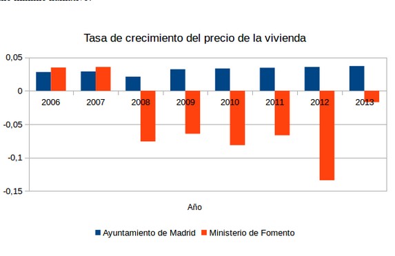 Si comparamos los datos calculados de esta manera con los incrementos en el precio de la vivienda para Madrid publicados por el Ministerio de Fomento obtenemos el siguiente resultado.