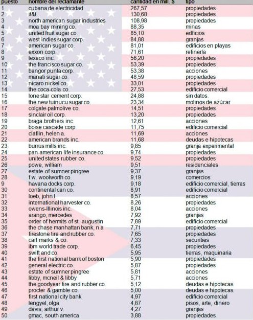 Coca-Cola, Exxon o el First National Bank de Boston, son algunas de las compañías afectadas por la expropiación, aunque también afectó a particulares. A día de hoy, hay más de 6.000 reclamaciones de propiedad presentadas a raíz de este atropello a los propietarios. Los expertos aseguran que este problema será un asunto muy difícil de resolver entre ambos países, ya que Cuba alegará que no puede asumir su deuda y que muchos de los reclamantes individuales han muerto y algunas de las empresas ya no existen.