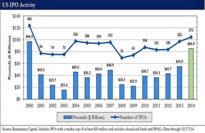 En 2014, han salido al parqué 273 empresas en EEUU, logrando captar capital por valor de $84.900 millones. Esta cifra supone un récord, sólo superado por los casi $97.000 millones que se lograron captar en 2000, en pleno apogeo de la burbuja de las puntcom.