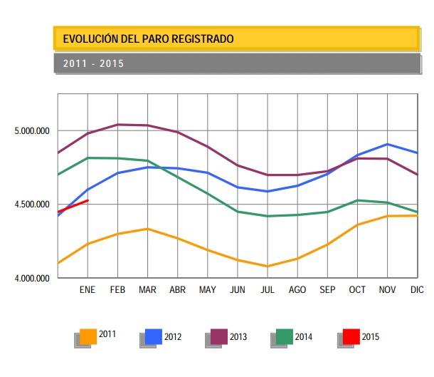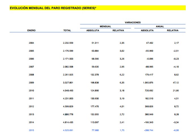 Así, el número de parados registrados ha subido en 77.980 personas respecto a diciembre y se ha situado en 4.525.691 parados. Esta cifra todavía no ha logrado bajar de los 4.447.711 millones de parados con los que terminó José Luis Rodríguez Zapatero su legislatura en 2011, aunque la supera en 77.980 personas. La parte positiva de este dato es que el aumento supone el menor repunte en un mes de enero desde el año 2007, cuando aumentó en 59.635 desempleados.