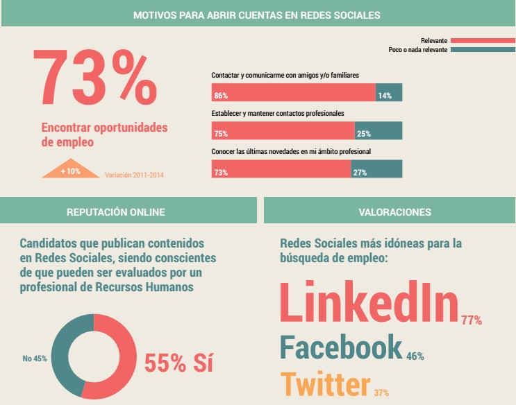 El uso de las redes sociales como herramienta de apoyo para la búsqueda de empleo sigue en su etapa de escalada y consolidación. Así, el 76% de los candidatos, un 26% más que en el 2011, reconoce haber buscado empleo en estos canales. Durante los últimos años, la evolución de los candidatos que se han inscrito en una oferta de empleo que han conocido a través de las redes sociales ha aumentado un 30% respecto al 2011, alcanzando el 73% en 2014.