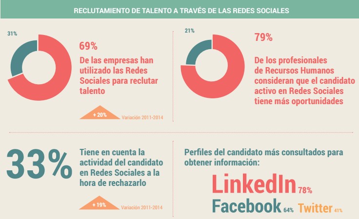 Y es que el 69% de los reclutadores han utilizado las redes sociales para seleccionar candidatos en 2014, un 12% más que en 2013. Cada vez son más las compañías que siendo conscientes de que no hay mejor candidato que el que ya es fan de su marca, siguen las actualizaciones de los que pueden ser sus futuros trabajadores.