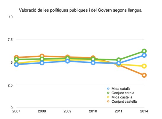 "La lengua y la valoración de la gestión no tiene mucho que ver entre 2007 y 2010. En 2011, quizás se pueden detectar algunos cambios. Pero entre 2011 y 2014, queda bastante claro que, de repente, las opiniones se modifican en función de la lengua", explica Lizoain. Además, la valoración global "pasa a ser muy superior a la media de las valoraciones parciales entre quien considera su lengua propia el catalán, y es muy inferior a esa media entre quien tiene el castellano como lengua propia".