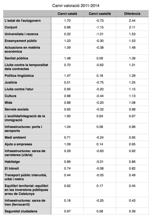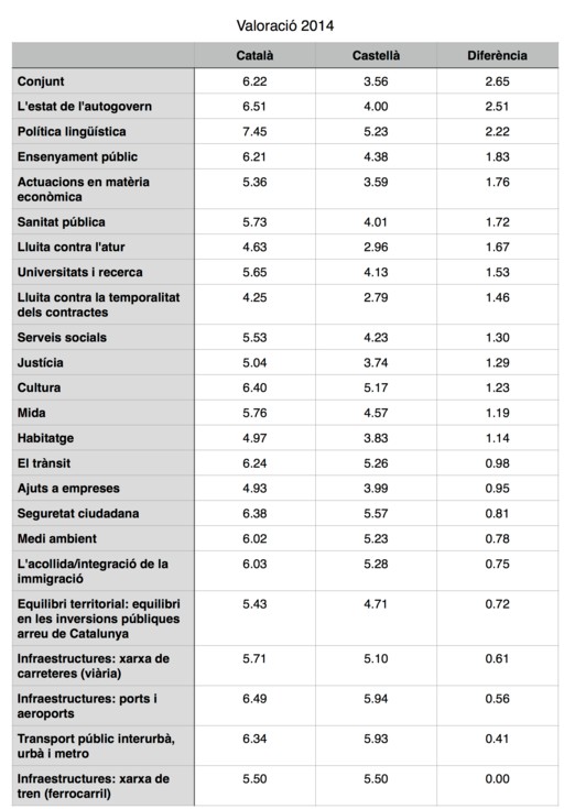 La siguiente tabla indica el cambio en la valoración de la gestión de la Generalidad en diferentes ámbitos entre 2011 y 2014, según la lengua.