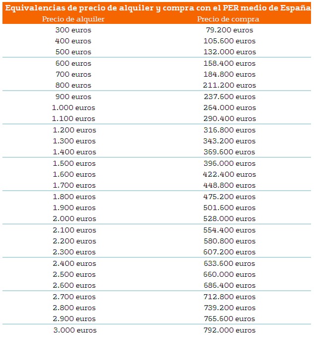 En resumen, cuanto más bajo sea el PER de una vivienda respecto a la media española (22 veces) mejor será comprarla, mientras que cuanto más alto sea, será mejor vivir en ella de alquiler.