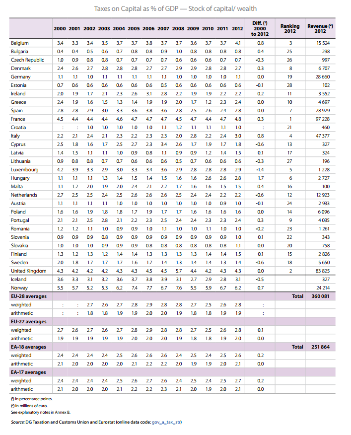 Al hilo de esta creciente insistencia política, cabe analizar el peso recaudatorio de los impuestos que se aplican a la riqueza en España y el resto de la Unión Europea. Esta información aparece recogida en los informes fiscales de Eurostat, que analizan la serie comprendida entre los años 2000 y 2012 y arrojan el siguiente resultado: