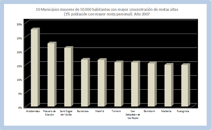 Miriam Hortas Rico y Jorge Onrubia Fernández han analizado datos oficiales del IRPF para establecer un ranking en el que vemos qué Ayuntamientos españoles cuentan con un mayor número de personas cuyos ingresos se sitúan entre el 1% más acaudalado del país. Los resultados son llamativos.