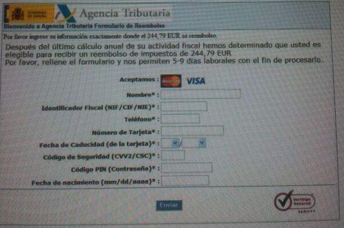 Los datos que solicitan son: nombre, NIF, número de tarjeta, fecha de caducidad, código PIN y fecha de nacimiento. La Policía Nacional y el fisco han advertido que ningún organismo público ni entidad financiera solicitará nunca datos bancarios a través de email o formulario. A continuación, una imagen del falso formulario: