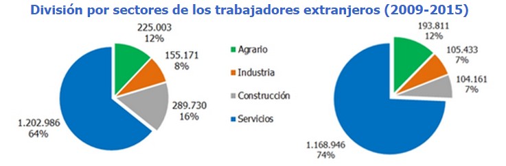 De esta forma, se aprecia un cambio en el peso de los trabajadores extranjeros cuando se analiza por sectores. Actualmente, el sector servicios ocupa al 74% de los trabajadores extranjeros, un porcentaje que se situaba en el 64% en 2009. Su representación se ha mantenido en el sector agrario, que sigue ocupando al 12% de los empleados extranjeros. El descenso más pronunciado se ha registrado en el sector de la construcción, donde trabajaba el 16% de ellos en 2009 frente al 7% actual.