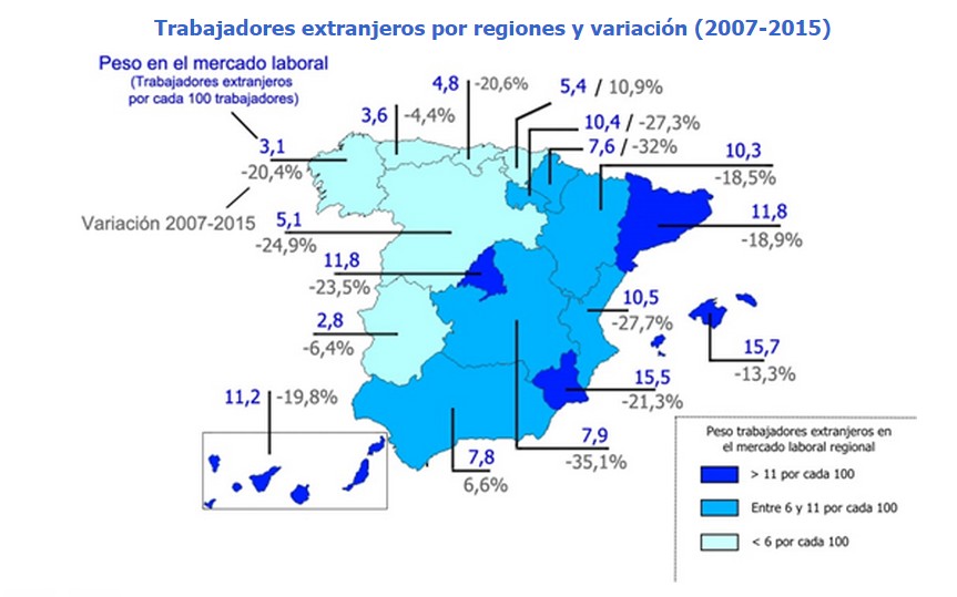 Andalucía, País Vasco, Asturias y Extremadura son las únicas regiones españolas donde los empleados extranjeros han aumentado su presencia en el mercado laboral desde 2007, según Randstad. Sin embargo, a nivel nacional, el porcentaje de trabajadores extranjeros sobre el total de ocupados ha descendido desde el 10,1% en 2007 hasta el 9,3% en 2015.