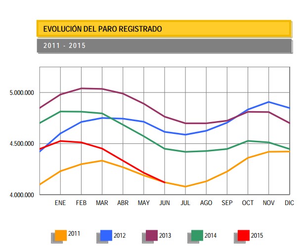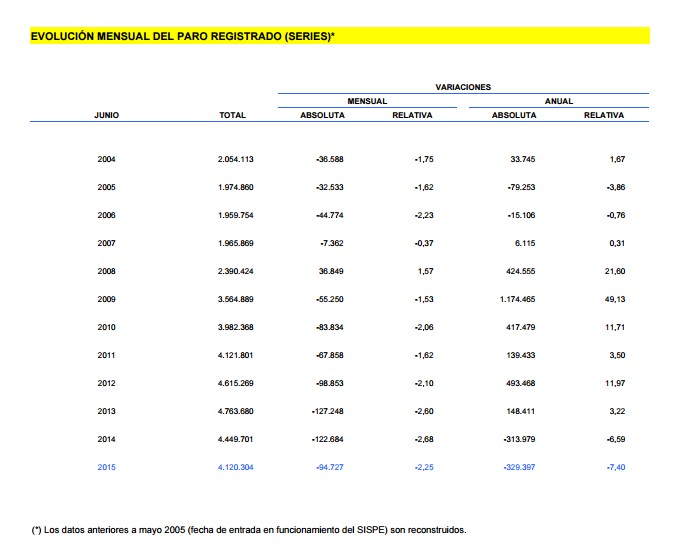 El mercado laboral termina junio con 94.727 parados menos. Tal y como ha publicado el Ministerio de Empleo y Seguridad Social, el número de parados registrados en las oficinas de los servicios públicos de empleo (antiguo Inem) bajó hasta las 4.120.304 personas, su menor nivel desde agosto de 2011.