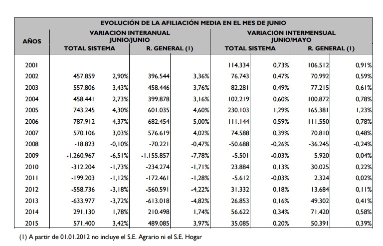 No obstante, en términos acumulados, el mes de junio cierra con el mejor dato interanual desde 2006, ya que ahora hay 571.000 afiliados más que hace un año. Pero el incremento de los cotizantes en el sexto mes del año de 2014 fue mucho menor: con 291.130 más. Hace 9 años, España llegó a crear en doce meses 787.912 empleos.