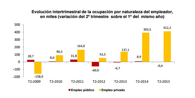 Por ello, aunque la ocupación aumenta en todos los sectores de la economía española, se observa que el sector servicios se lleva la mayor parte de la contratación, con 291.700 ocupados más. Por otro lado, la Industria sube en 64.800 ocupados, la Construcción en 32.300 y la Agricultura en 23.000. Otro dato a destacar es que todos los empleos creados entre abril y junio pertenecían al sector privado.