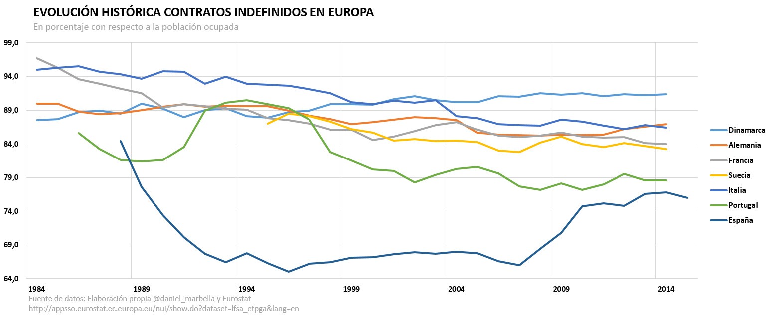 Aún así, la evolución histórica muestra claramente porcentajes de contratos indefinidos superiores al 80%, con paradigmas como Dinamarca, con valores superiores al 90% desde el año 2002 (Dinamarca presenta uno de las regulaciones del mercado laboral más liberalizadas del mundo).