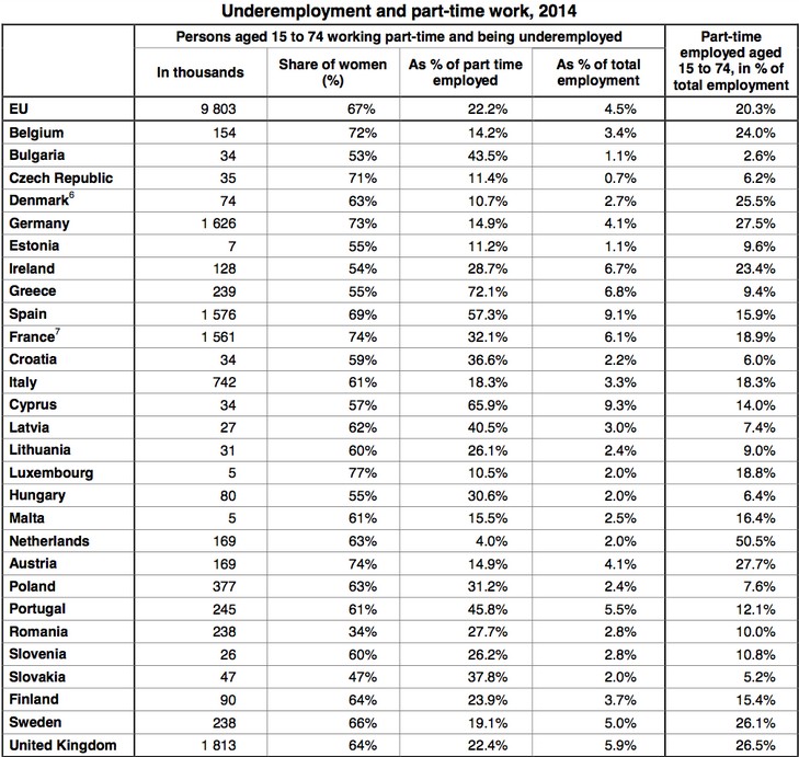 Aún así, se facilita otra métrica importante, como es la de subempleo, es decir, los empleados que trabajan menos horas de las que desearían (empleo parcial involuntario), o poseen cualificación superior al trabajo que desempeñan. De acuerdo a los últimos datos de Eurostat para 2014, el 9,1% de los trabajadores en España se encuentra en esa circunstancia con respecto al total de contratación, cuando la media de la Unión Europea está en el 4,5% (ver tabla siguiente, columna As % of total employment).