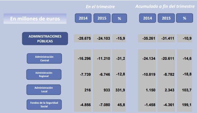 Así, según los últimos datos de la Intervención General de la Administración del Estado, que realizan una comparativa entre ambos periodos, el sector público español sólo ha reducido su brecha presupuestaria un 10,9% en los últimos 12 meses. Como se observa en el siguiente cuadro, apenas se reduce el déficit en 4.000 millones. Aunque son muy similares, por diferencias en la contabilidad, los datos de capacidad o necesidad de financiación no son exactamente iguales a los publicados por Hacienda.