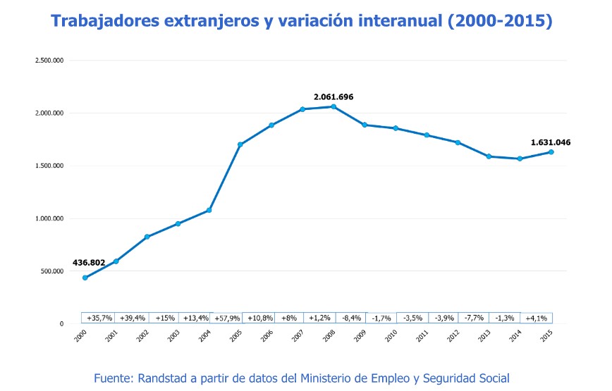 El número de trabajadores extranjeros en España ha aumentado en septiembre de 2015 por primera vez desde el año 2008, según los últimos datos de Randstad. Fue en ese periodo cuando, después de ocho años creciendo, el volumen de este colectivo tocó techo. Entonces, a partir de 2008, se registraron siete años de descensos hasta ahora.