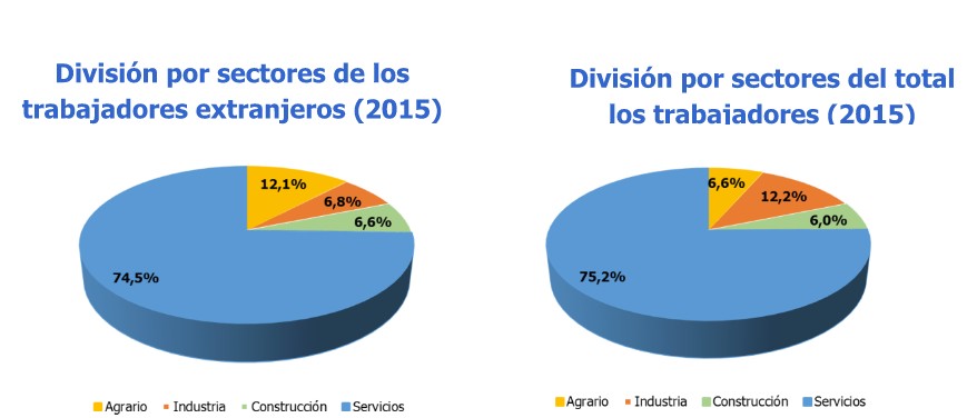 En términos absolutos, todos los sectores de actividad han aumentado su número de afiliados extranjeros respecto a 2014. El sector servicios es el que más empleados de este grupo ha sumado, 40.149 afiliados, hasta alcanzar 1.215.448 trabajadores de este colectivo. Le siguen construcción (+11.513), agricultura (+6.182) e industria (+5.778).