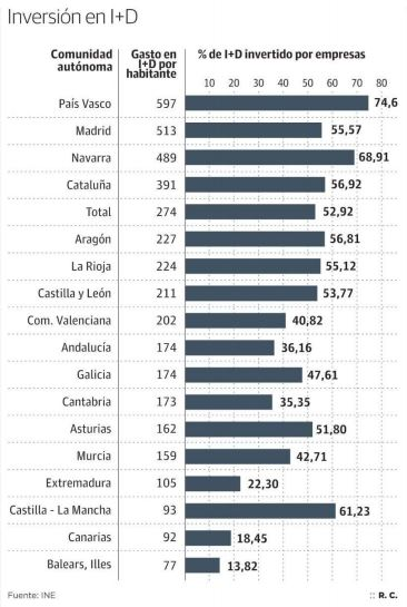 Frente al discurso político habitual, las estadísticas demuestran que aquellas comunidades autónomas donde hay una mayor presencia de I+D, el éxito viene principalmente de la inversión privada. De media, el desembolso per cápita en innovación y desarrollo es de 274 euros al año... pero las diferencias territoriales son significativas.