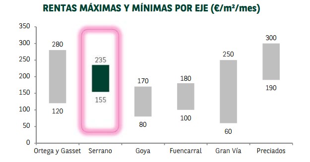 Longchamp, Michael Kors, Loewe o Gucci comparten calle con Zara o Massimo Dutti. La moda ocupa una cuarta parte de los sectores de actividad de Serrano y se sitúa sobre todo, en los tramos que van de la Embajada de América a Alcalá. Tras las obras de remodelación, el pasado año se produjeron 25 aperturas en Serrano. En 2015, las rentas han subido en esta vía hasta los 220 euros el m² al mes, un 21% más que en 2014. Actualmente, hay 31 locales vacíos en Serrano, la mayoría situados en números impares.